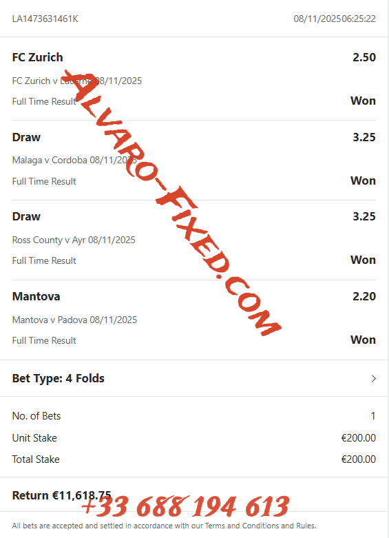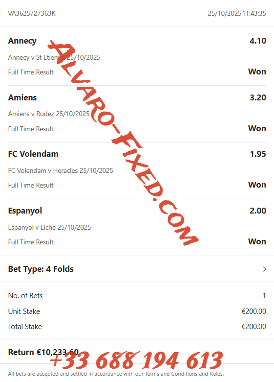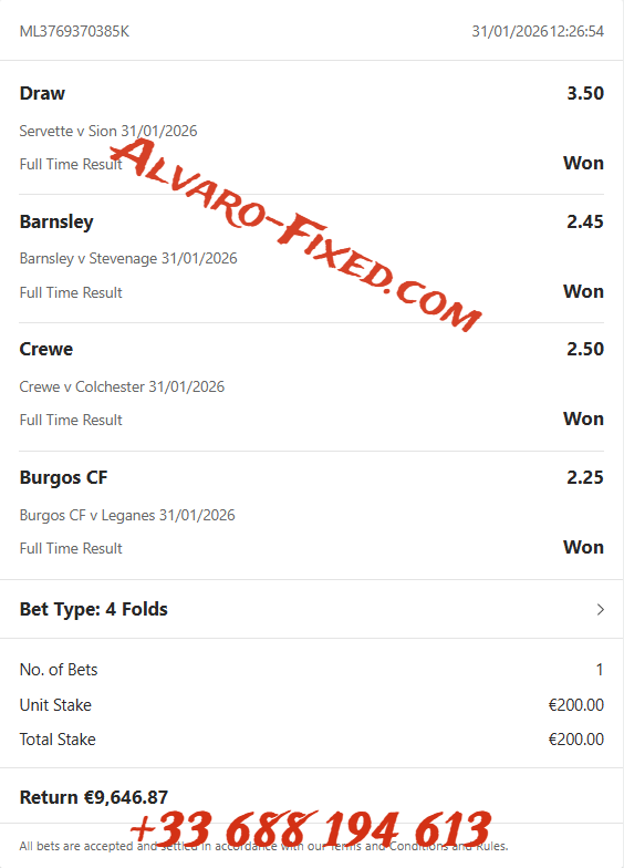 Four ( 4 ) fixed games with best big odds. About this ticket remember will be limited number of costumers because odds is high and some betting shops can understand that somebody sell this kind of odds and can blocked our games. But just don't worry, follow our steps every time and you will be safe.