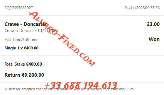 If you are not happy with small odds, there will be offer for big one ticket. We can show here our best vip fixed ticket with odds around 100. There will be one ticket per weekend ( just for saturday or sunday ) with four matches. Picks for ticket will be depending on the agreement with the teams, but most important thing will be 100% profit guaranteed.